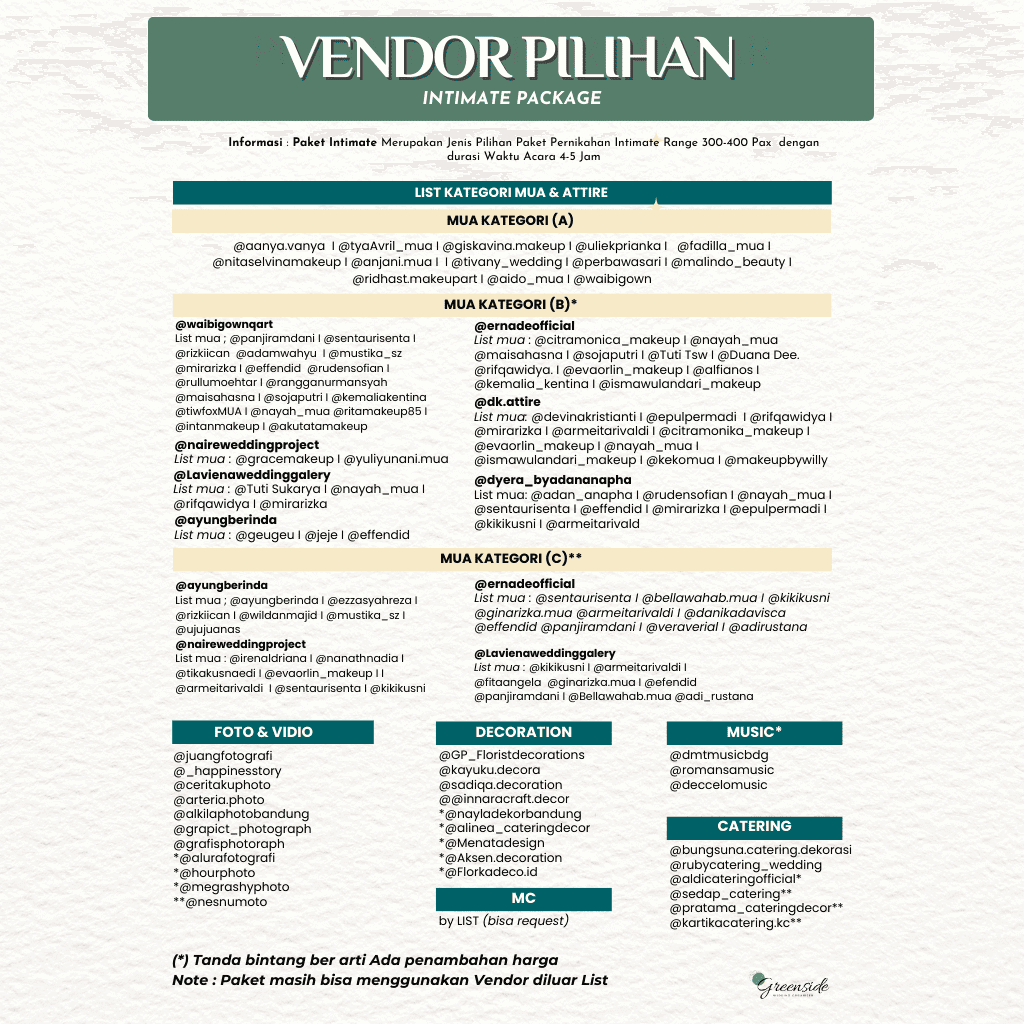 D. SETIAP CLIENT SETELAH PERIODE DEALING AKAN DIBUATKAN AKUN PADA WEBSITE WWW.GREENSIDE WEDDING. COM UNTUK MENGETAHUI DETAIL PAKET & PEMBAYARAN .